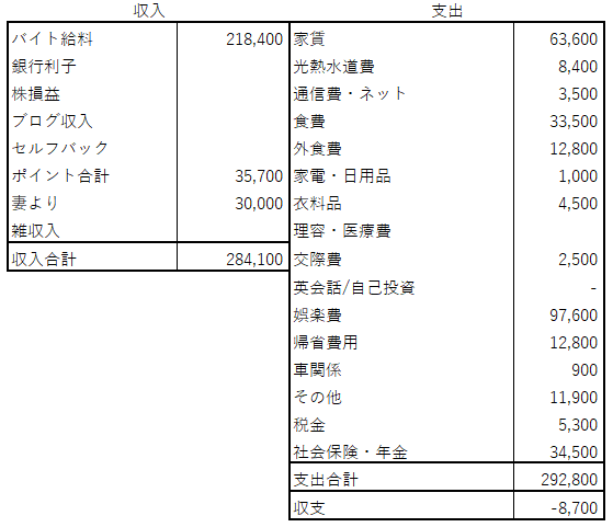 6月は収入284,100円に対し、支出292,800円となり、トータルで8,700円の赤字となってしまいました。